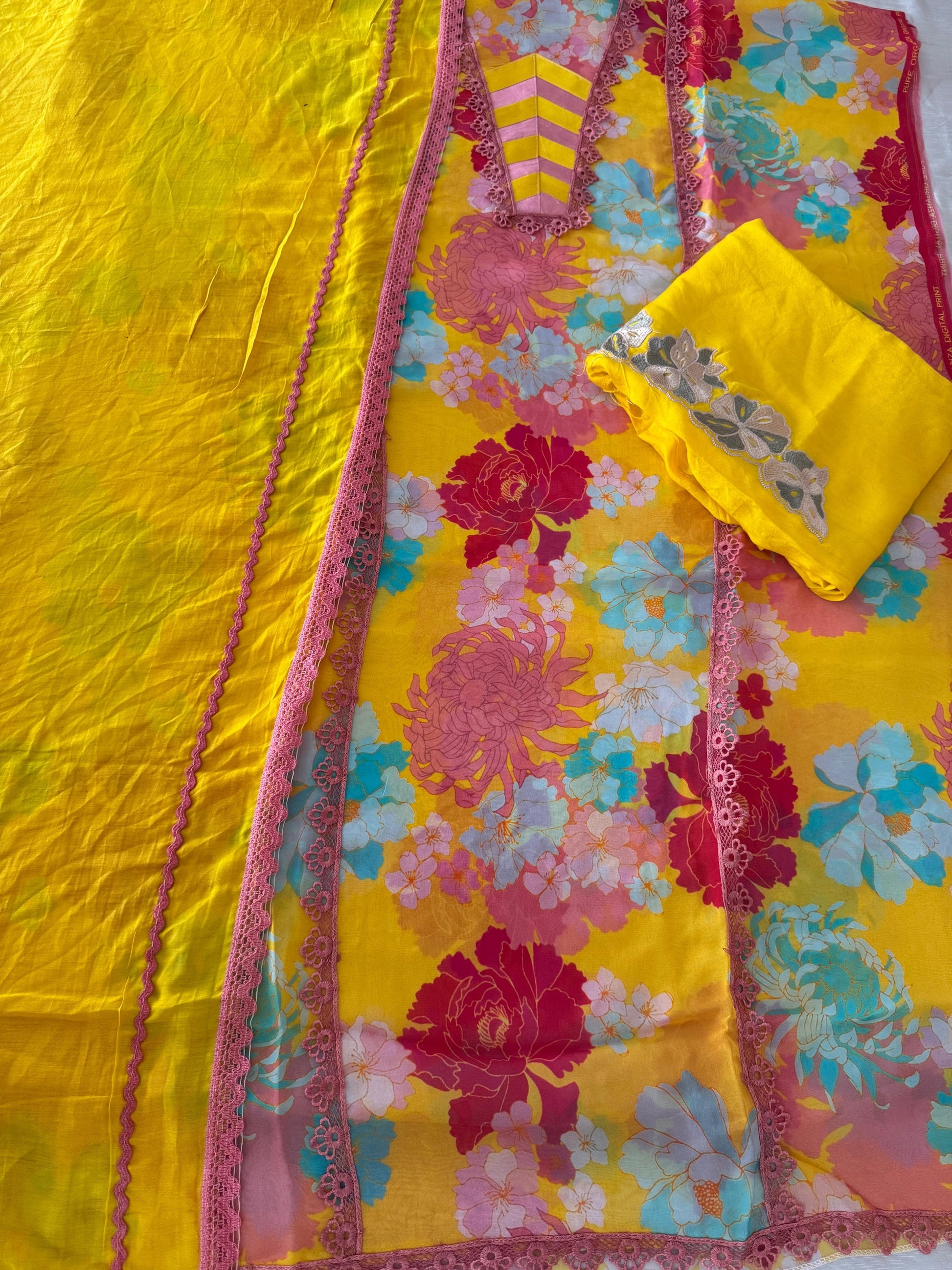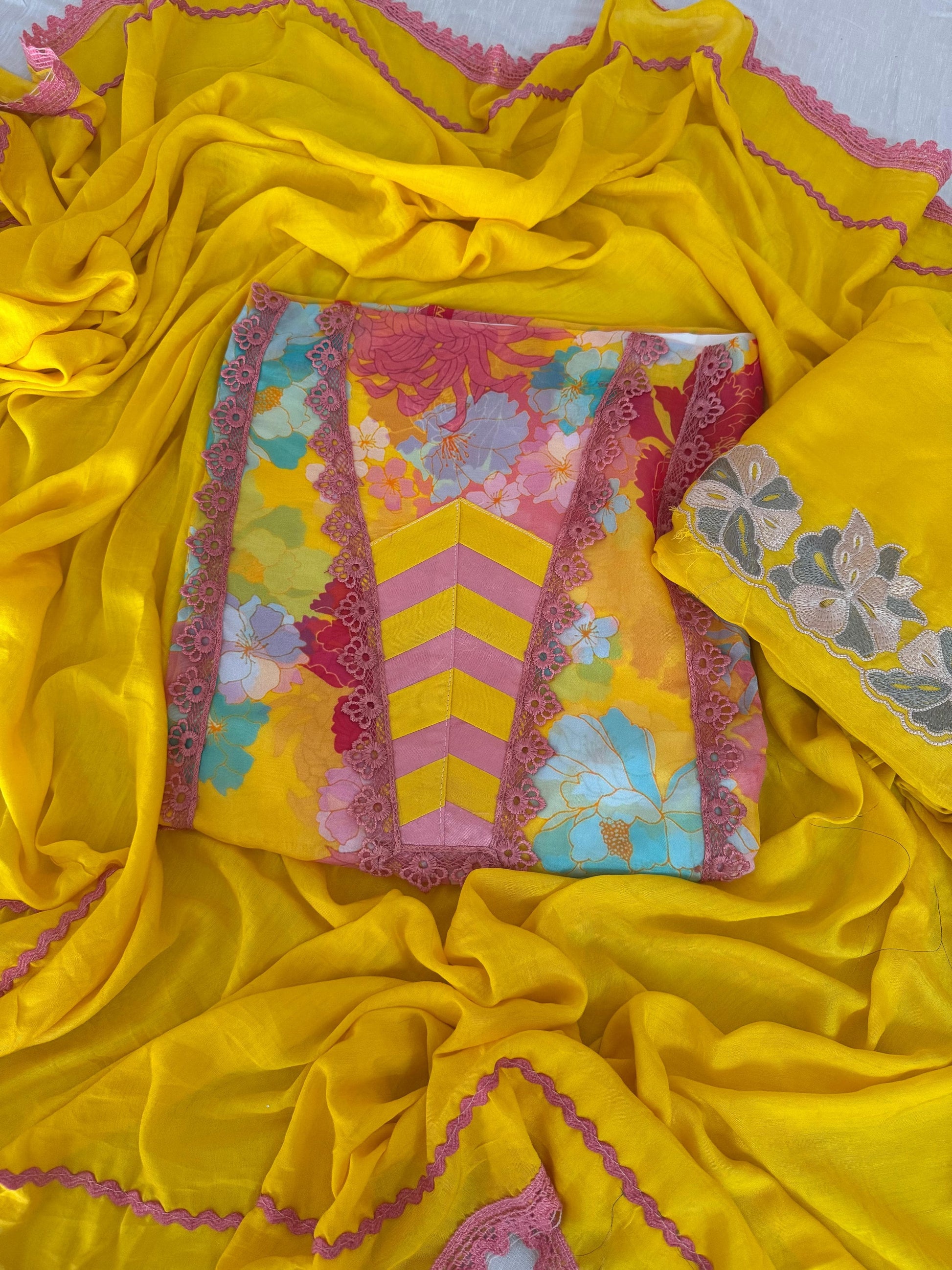This elegant yellow outfit features intricate lace work and a designer neckline, offering a sophisticated look 🌼. Made from breathable cotton, it ensures all-day comfort and is easy to wash for hassle-free care 🧺. The detailed bottom work adds a stylish finish, making it perfect for both casual and festive occasions ✨.
