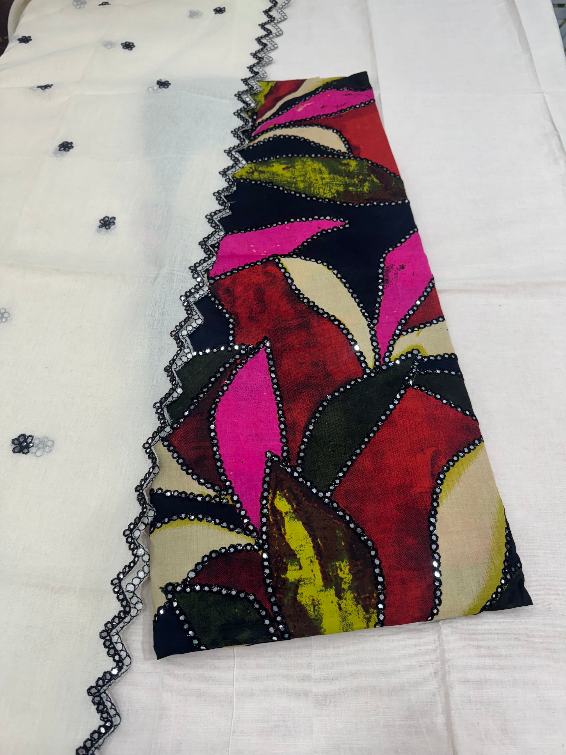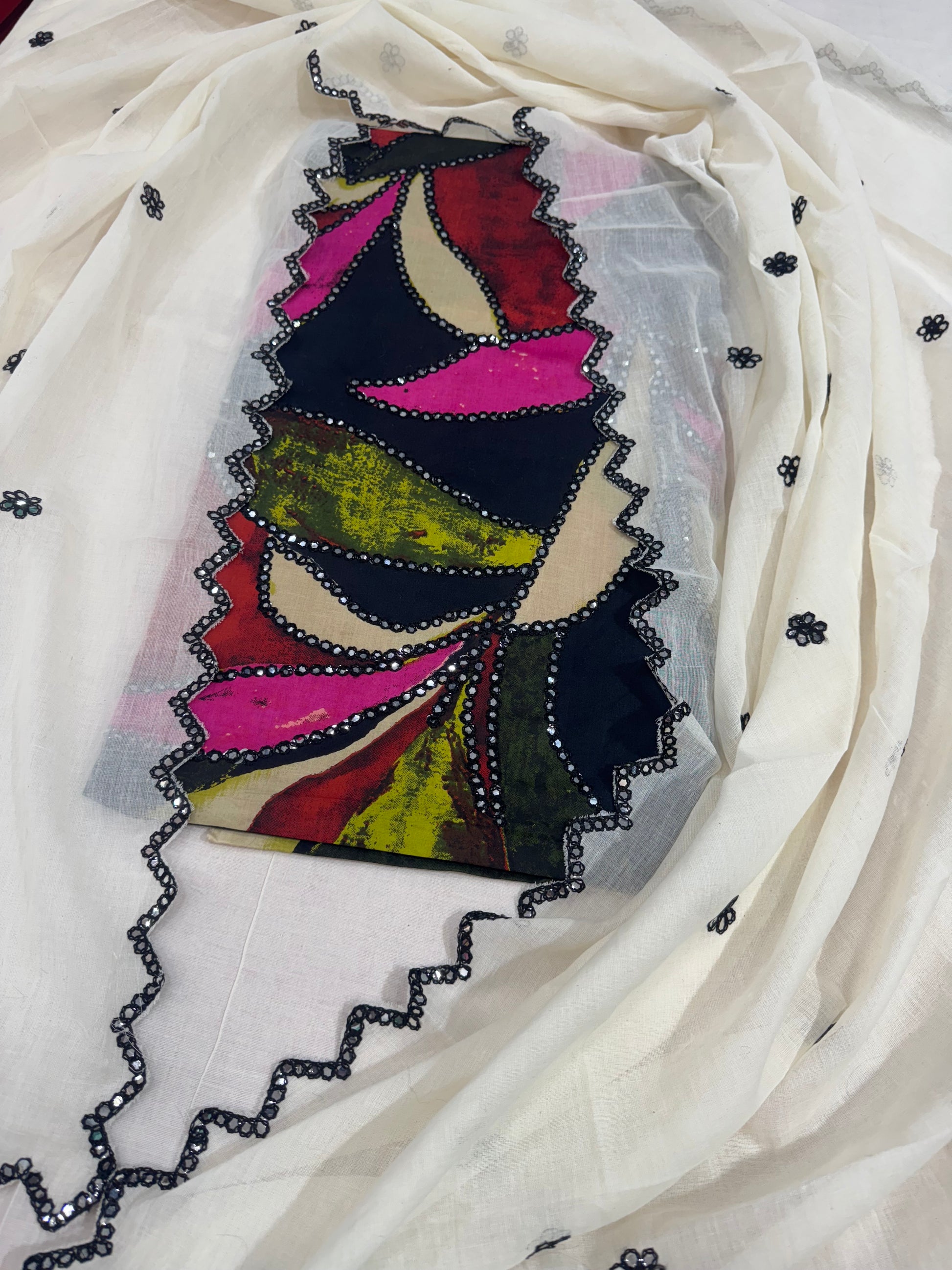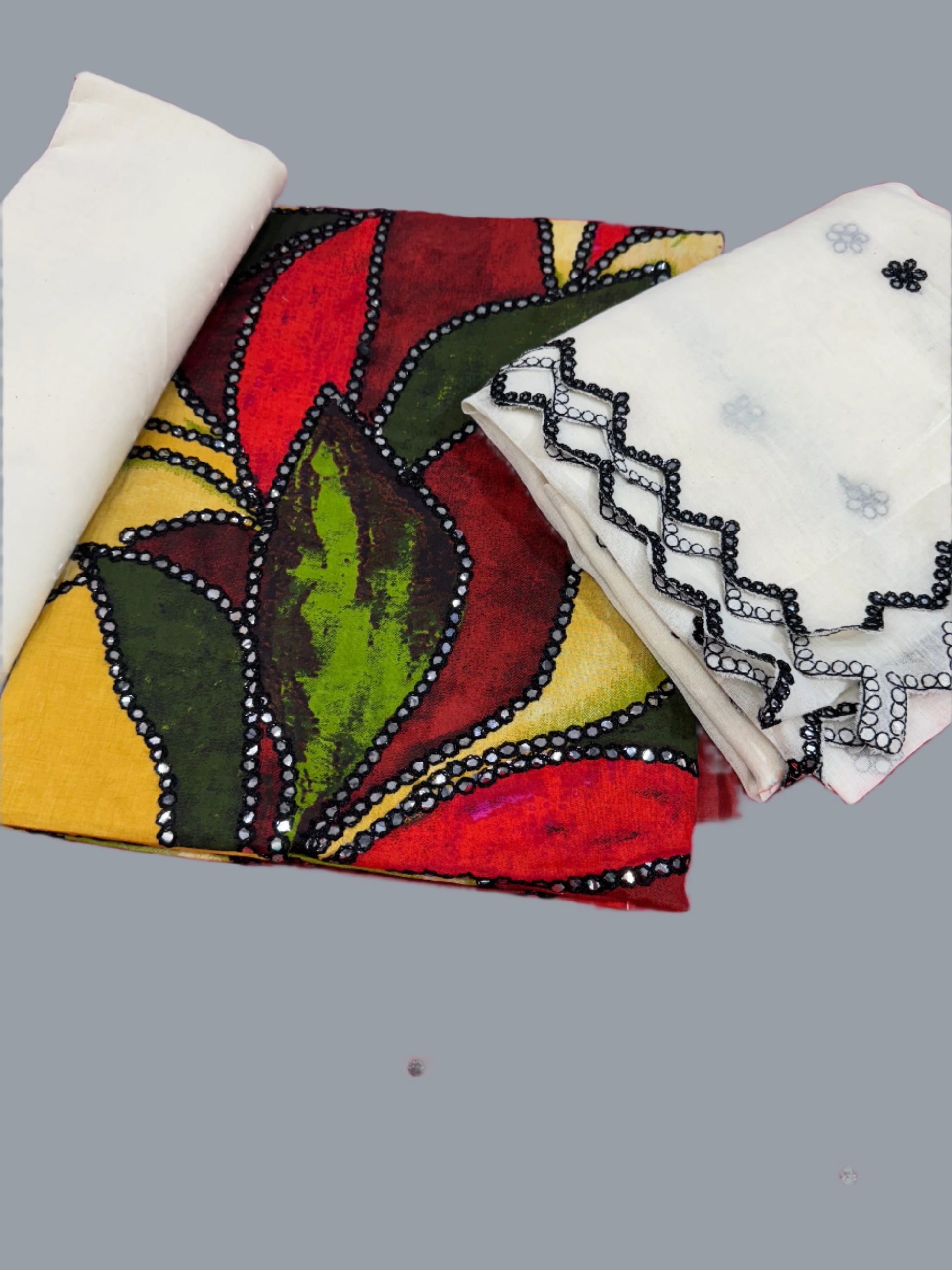 Make an elegant and bold style statement with this unstitched 3-piece suit set. The vibrant kurta fabric features a multicolor leaf pattern in hues of red, mustard, pink, olive green, and black, highlighted with stone embellishments for added sparkle. It is paired with a soft off-white dupatta adorned with delicate black floral embroidery and lace edging, adding a touch of sophistication. The plain off-white bottom fabric ensures balance and versatility.