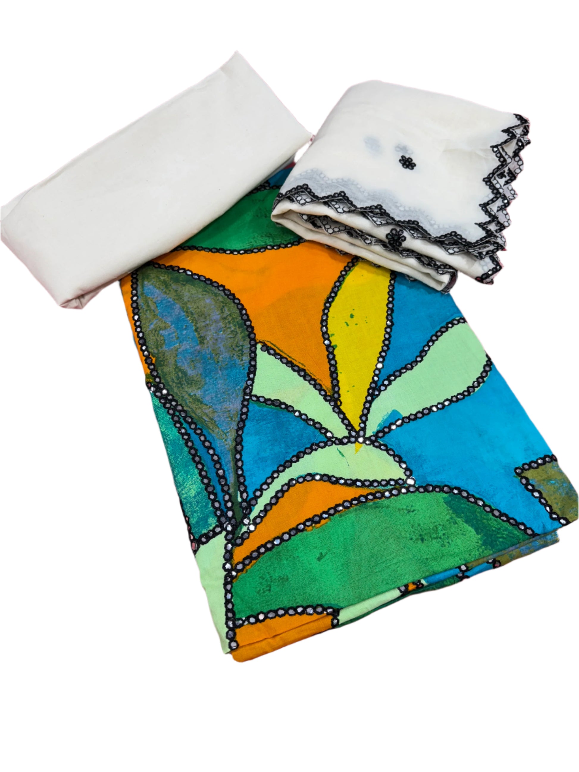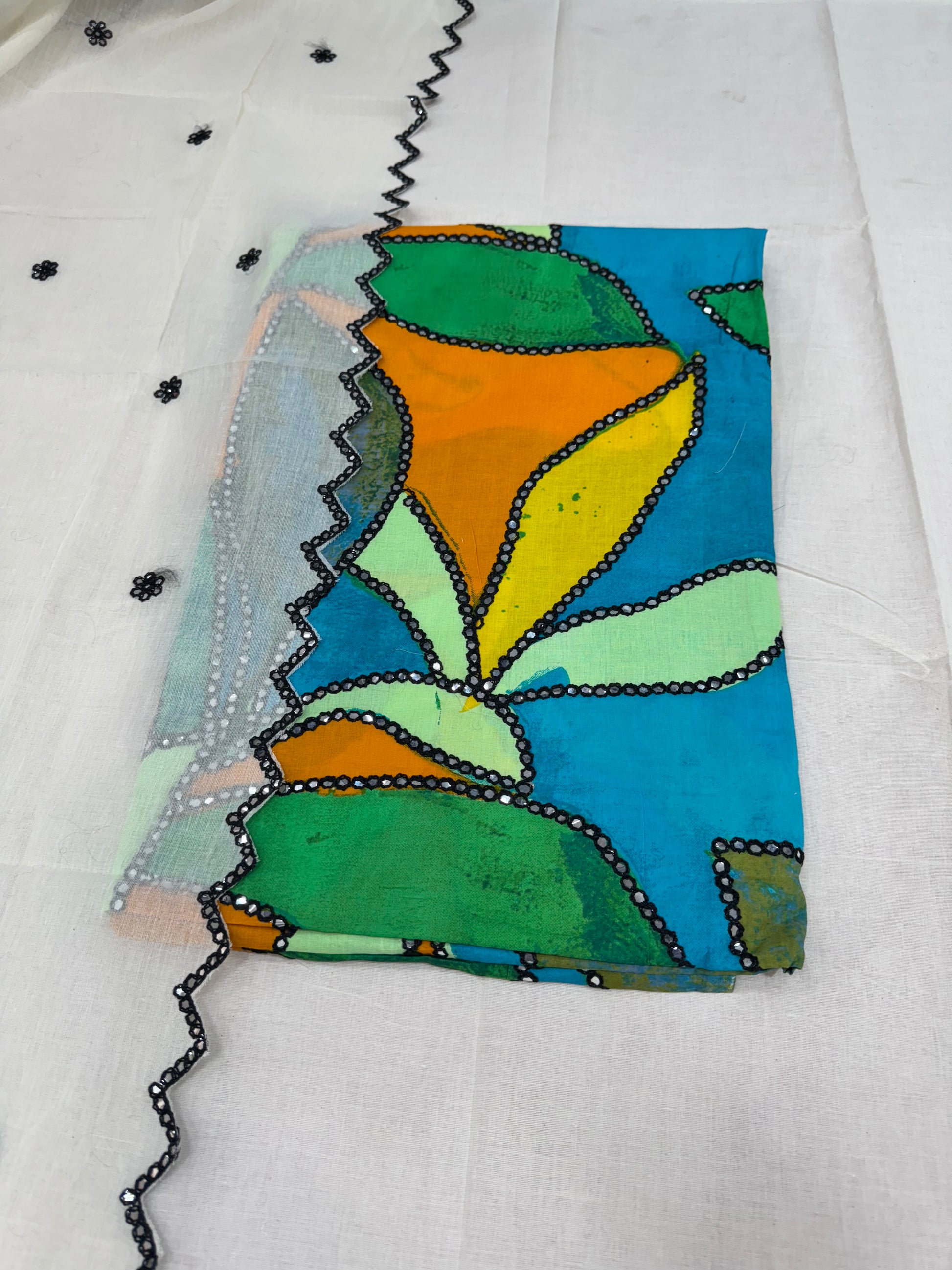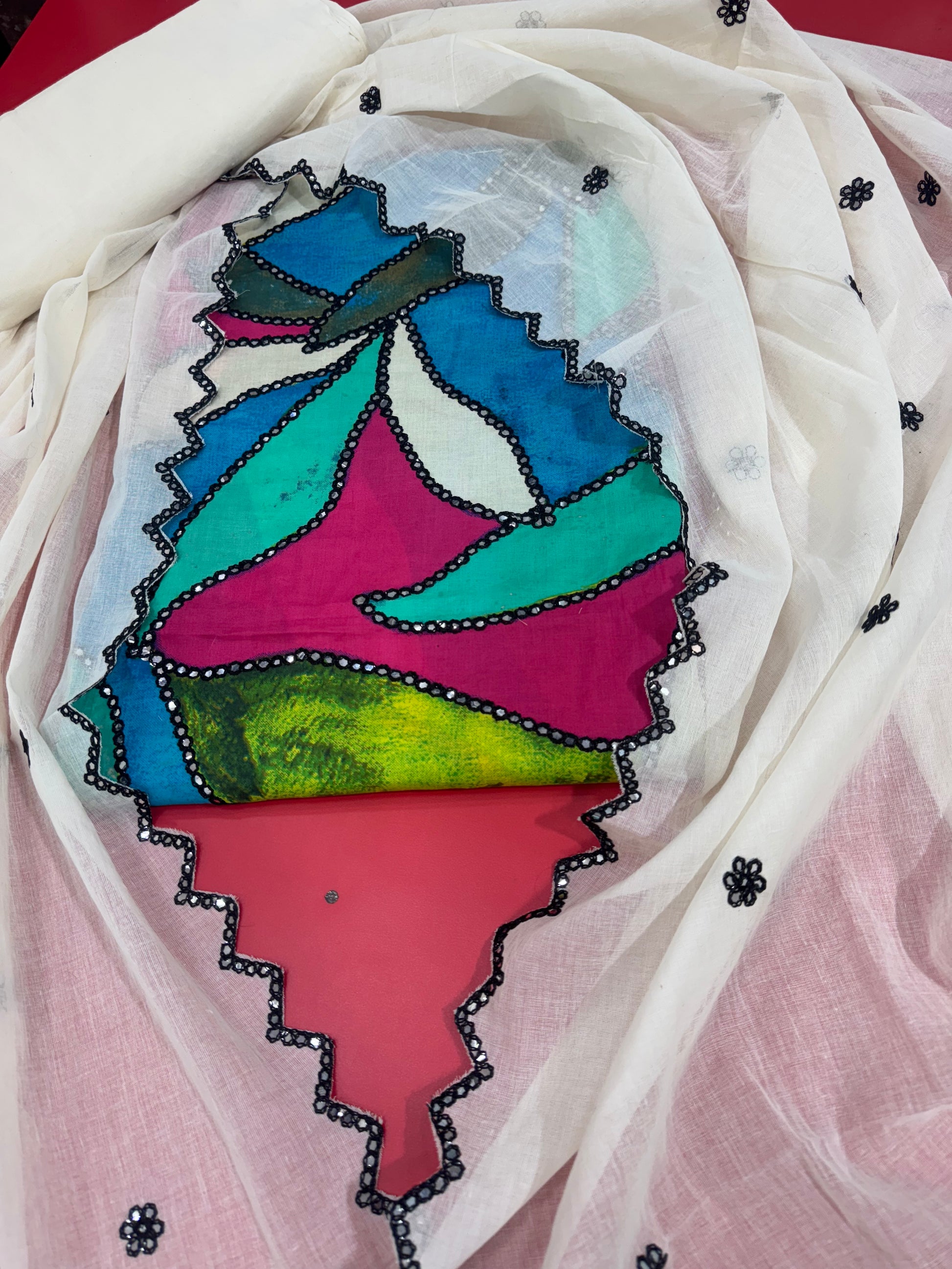 Make an elegant and bold style statement with this unstitched 3-piece suit set. The vibrant kurta fabric features a multicolor leaf pattern in hues of red, mustard, pink, olive green, and black, highlighted with stone embellishments for added sparkle. It is paired with a soft off-white dupatta adorned with delicate black floral embroidery and lace edging, adding a touch of sophistication. The plain off-white bottom fabric ensures balance and versatility.