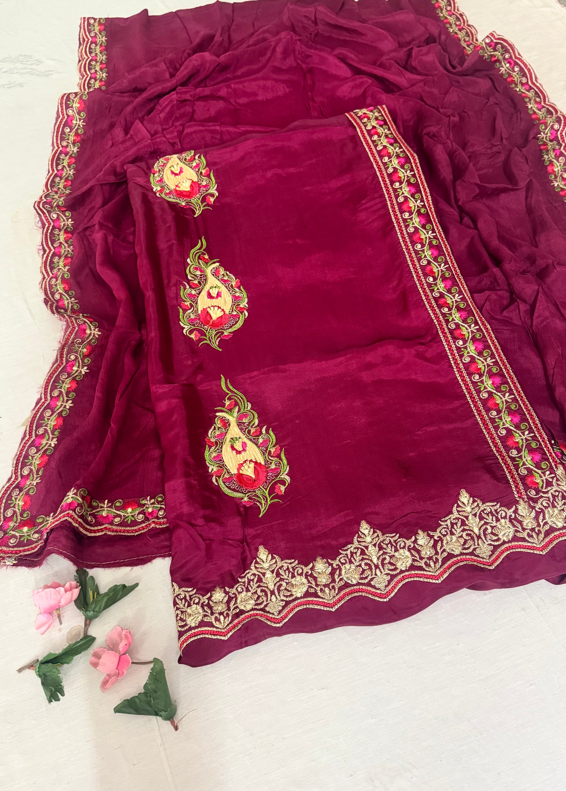 Indulge in the timeless beauty of our premium silk suit set featuring exquisite handwork embroidery. This stunning ensemble showcases traditional craftsmanship with contemporary elegance.