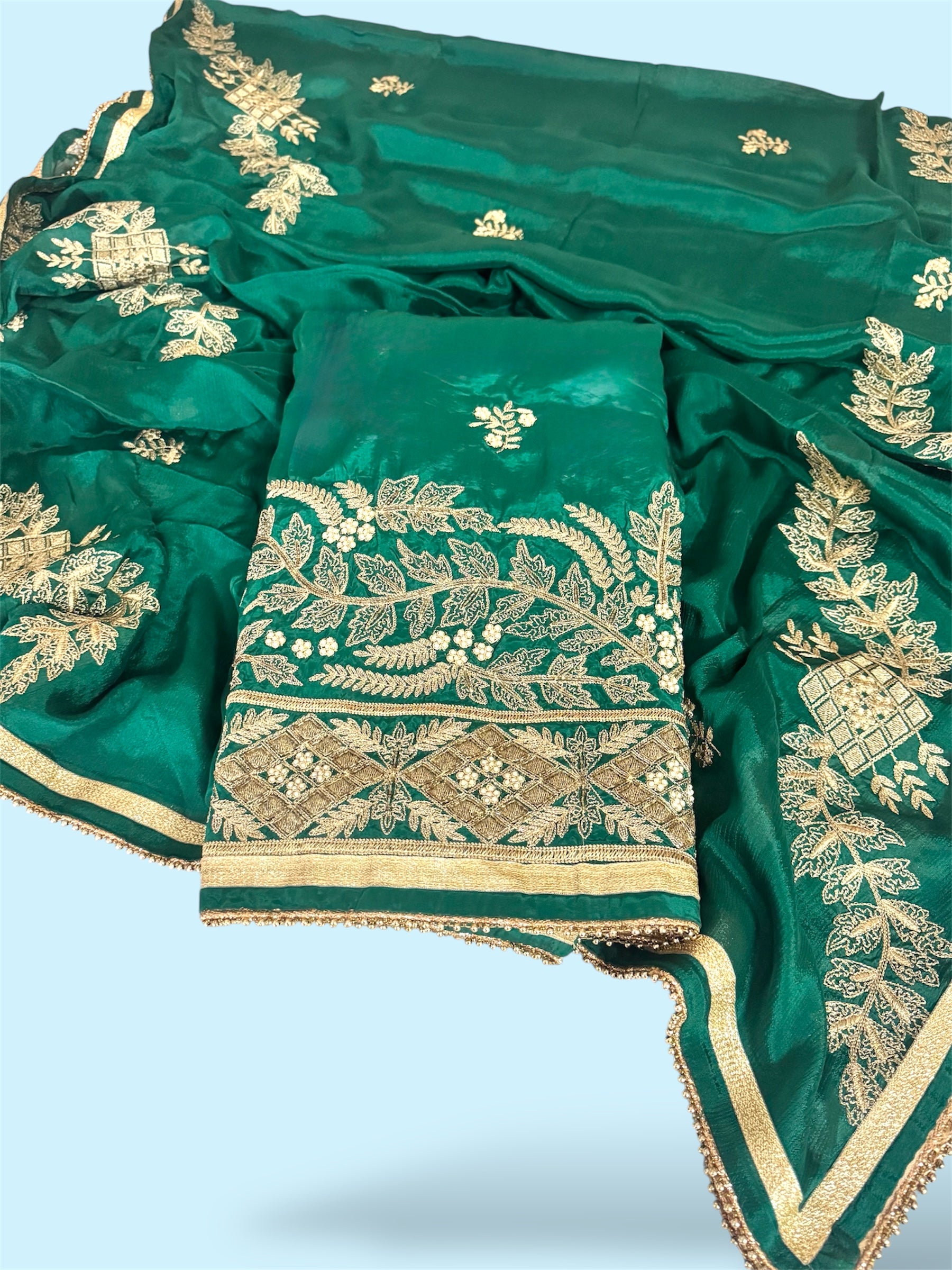 Celebrate Karwa Chauth in style with this exquisite green embroidered suit set. This stunning ensemble features intricate golden zardozi work and delicate floral motifs that shimmer beautifully under festive lights.