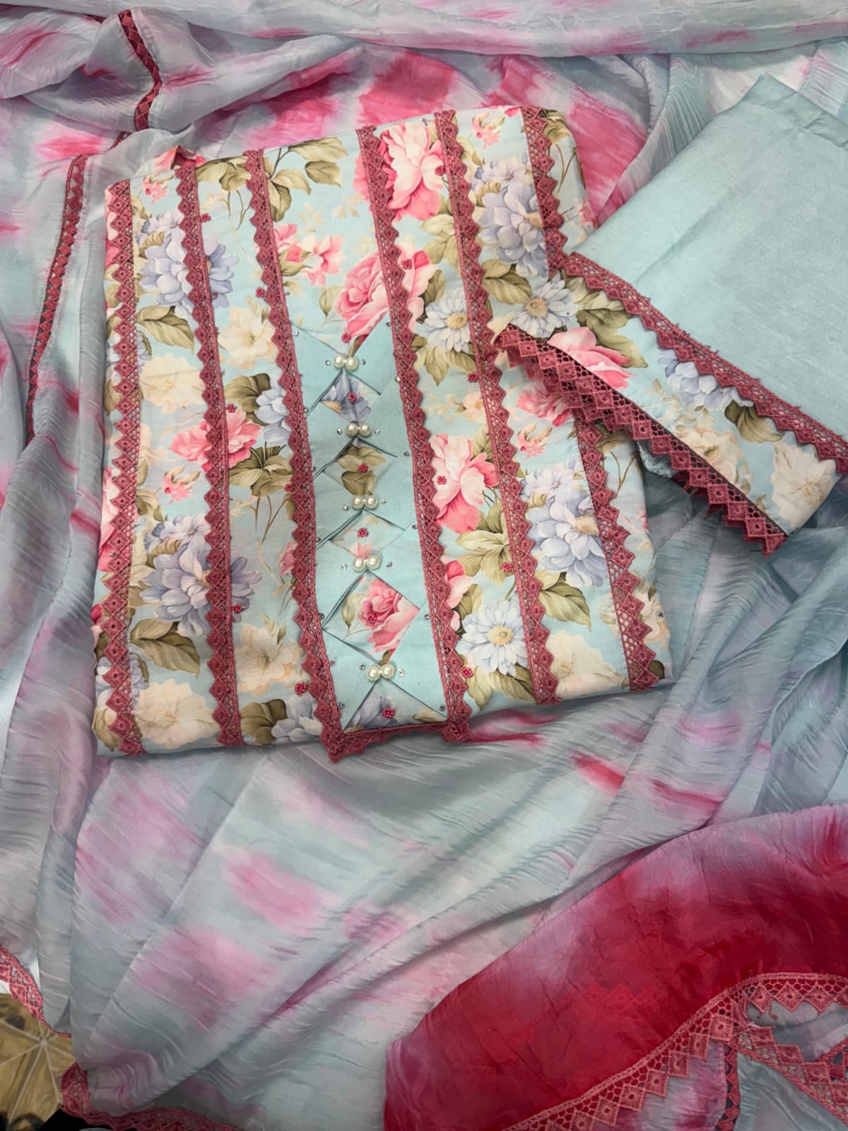 This Pakistani suit set is made from high-quality maslin cotton fabric. It features a beautiful floral print and intricate lace work. The bottom of the suit set has a unique patchwork design, adding a touch of elegance to the overall look. Perfect for special occasions or everyday wear.