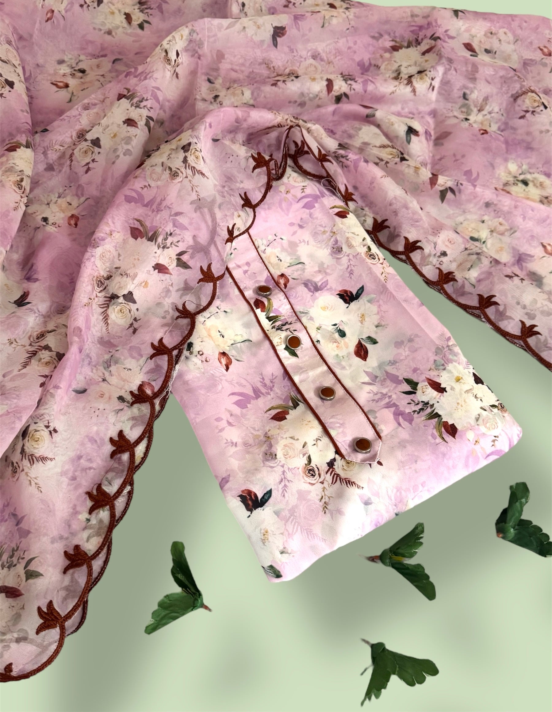 Add elegance to your ethnic ensemble with this exquisite pink floral organza dupatta featuring intricate cutwork details. This lightweight and airy dupatta showcases beautiful rose motifs with delicate cutwork embroidery that creates a stunning visual appeal.