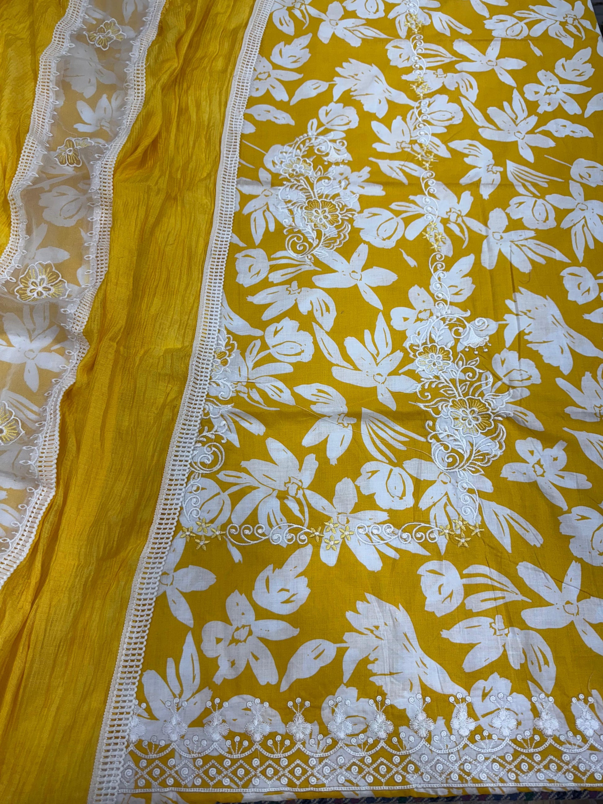 Bring a splash of sunshine to your festive wardrobe with this vibrant yellow designer dupatta set. Crafted from soft cotton and adorned with intricate hand embroidery, this piece is a beautiful blend of comfort and elegance. The rich mustard-yellow base is highlighted by delicate white floral motifs and sheer organza panels embroidered with complementing flower patterns, making it a perfect choice for daytime functions and celebrations.