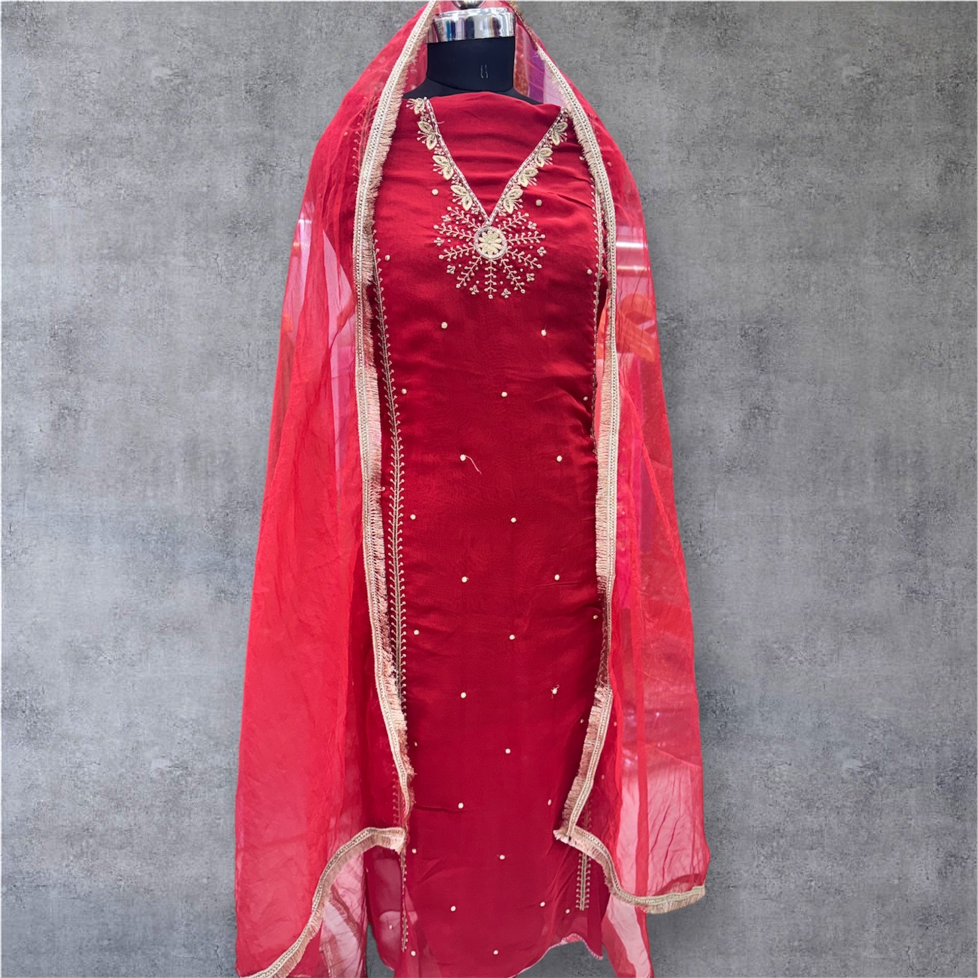 This V neck style suit features a unique cut that flatters the neckline, while the intricate bottom work adds texture and depth to the design. The delicate lace work on the dupatta adds a touch of elegance and completes the look. Elevate your style with this timeless suit.
